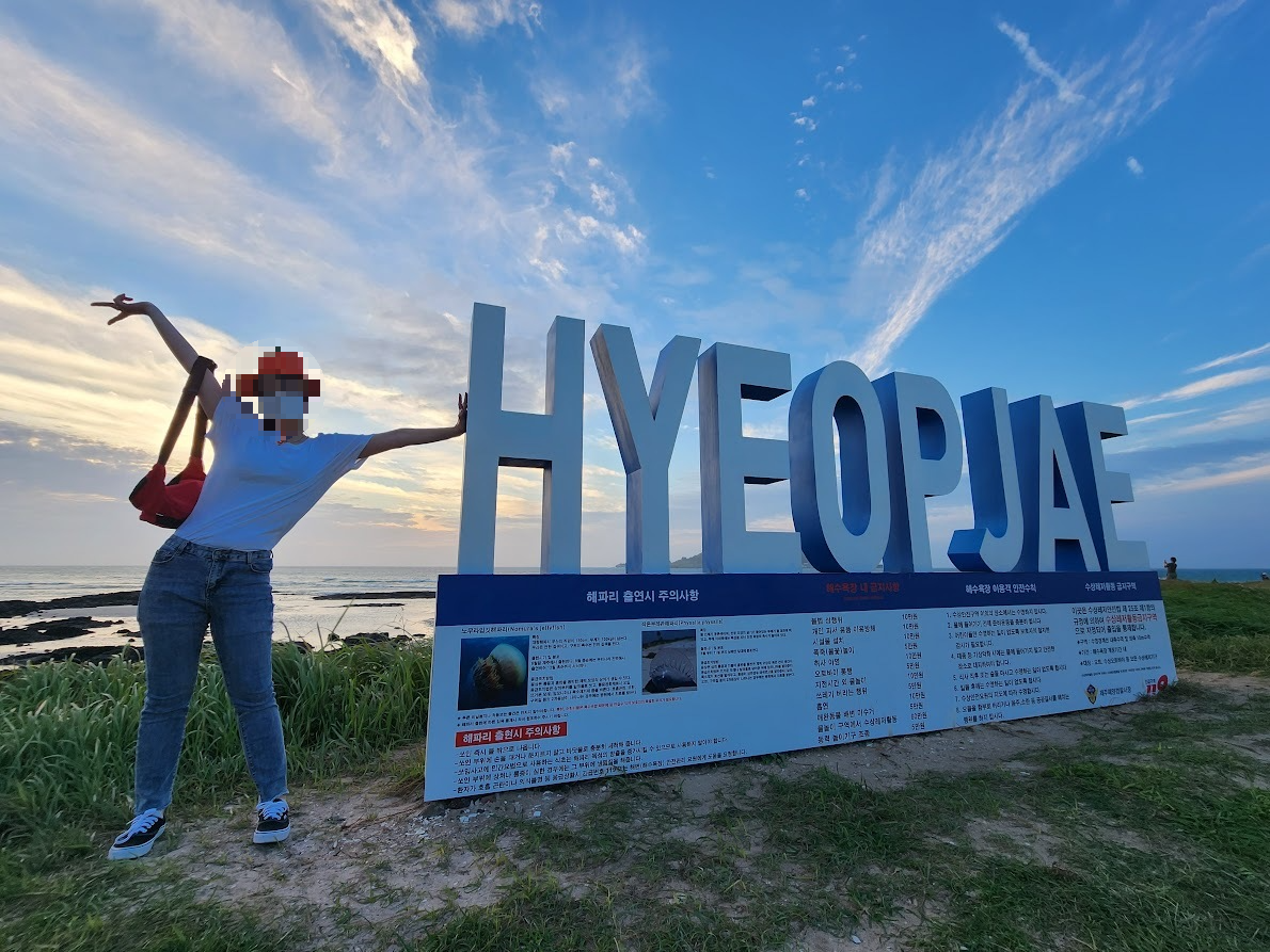 협재 해수욕장에 왔으니 간판에서 인증샷 한번 찍어줘야지.