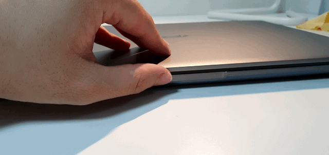 스토퍼가 양쪽에 달려있는 이유는 ASUS의 에르고 리프트 때문이다. 아래 GIF 사진을 보면 노트북 덮개를 여는 순간, 지렛대처럼 상판이 바닥을 지지하고 하판이 올라가는 것을 볼 수 있다.